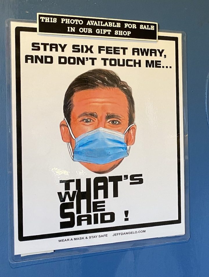 Now on the second floor of the mall, the sign sits on AstroTurf in front of a printed screen of Scranton. Not quite the same as if it were outside, but it’s still a good photo op for “The Office” superfans!