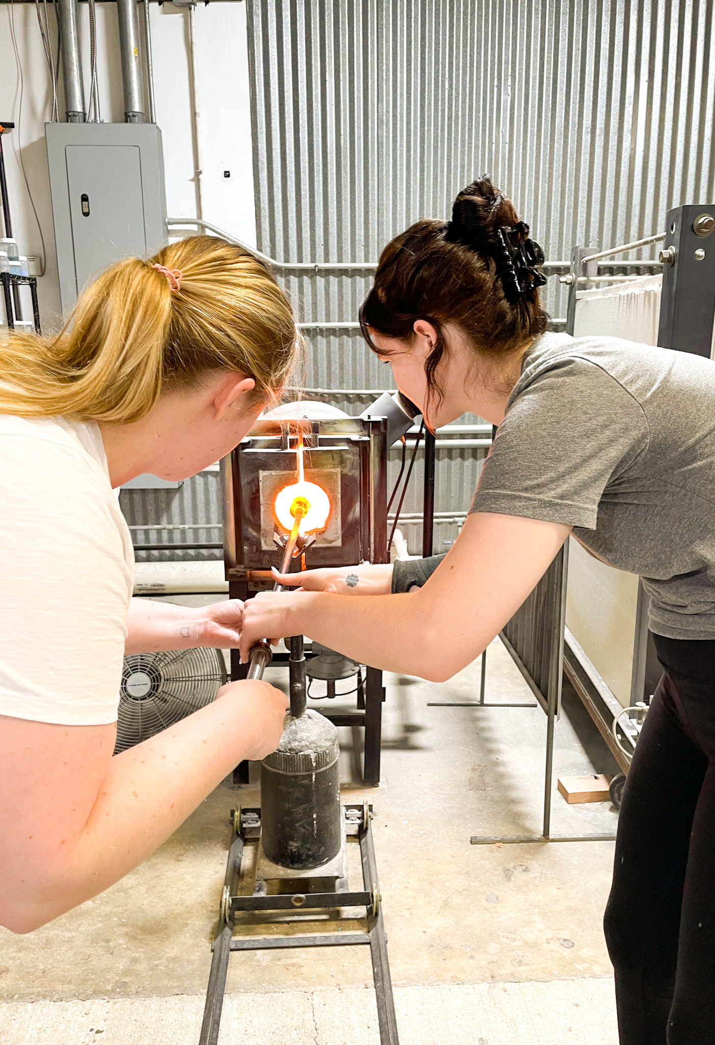 Our favorite part was gathering the molten glass from the 2,100-degree furnace and rolling it out like dough.