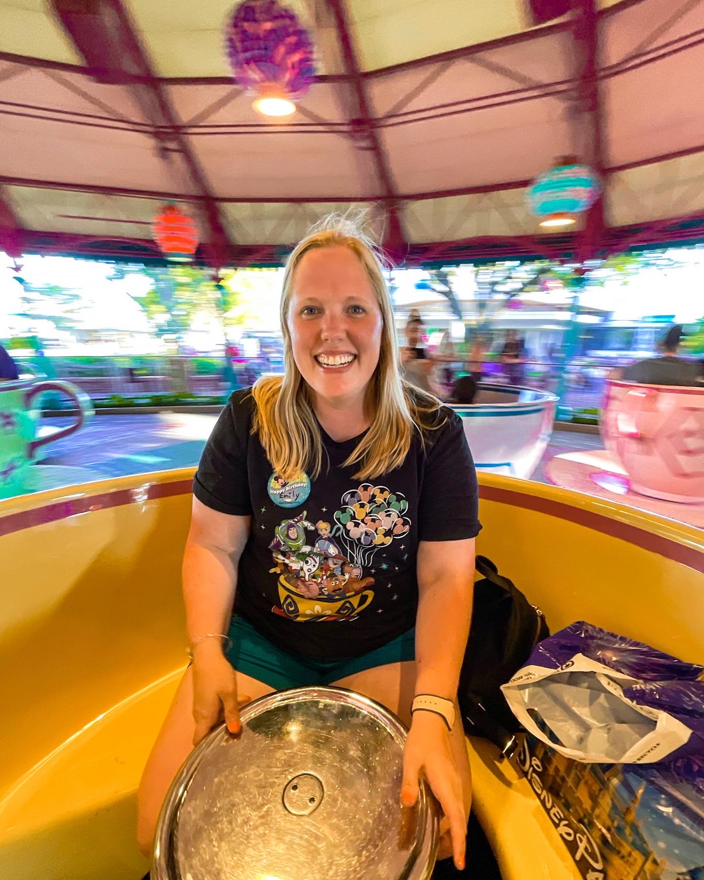 This is the face of pure joy. 😁 The Mad Tea Party spinning teacups made us feel like kids again, trying to spin faster and faster until we couldn’t see straight anymore. We had regretted not riding the teacups at Disneyland and didn’t want to make the same mistake twice. Plus, I was wearing a teacup shirt – of course I was going to ride it! I’m so glad Mike snapped this picture of me, because it perfectly captures the feeling we had at Disney World.
